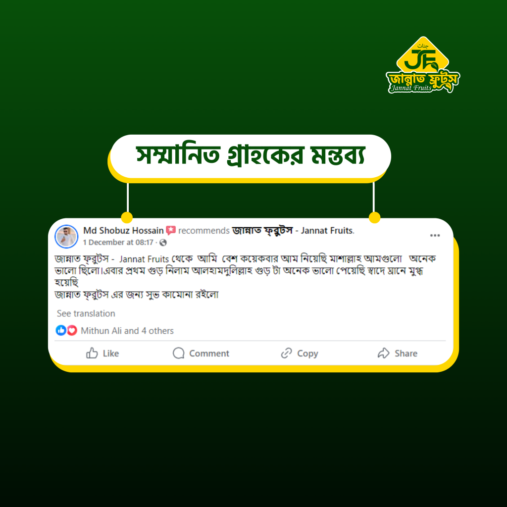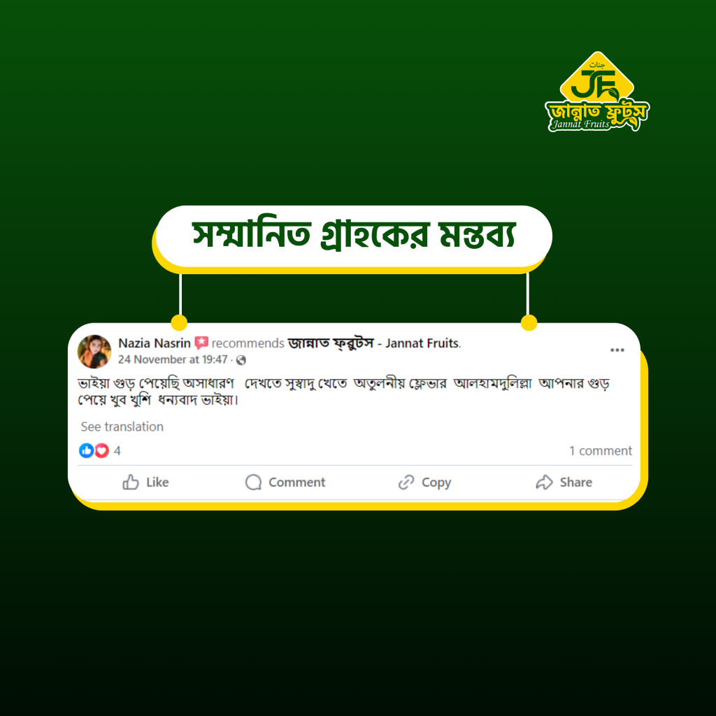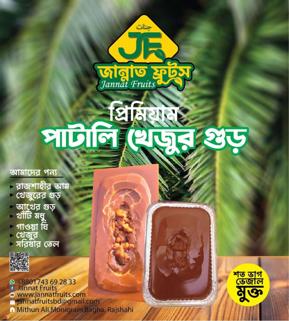 জান্নাত ফ্রুটস হোম ডেলিভারি ও পয়েন্ট ডেলিভারিতে সারা বাংলাদেশে খেজুর গুড় সরবরাহ করে
