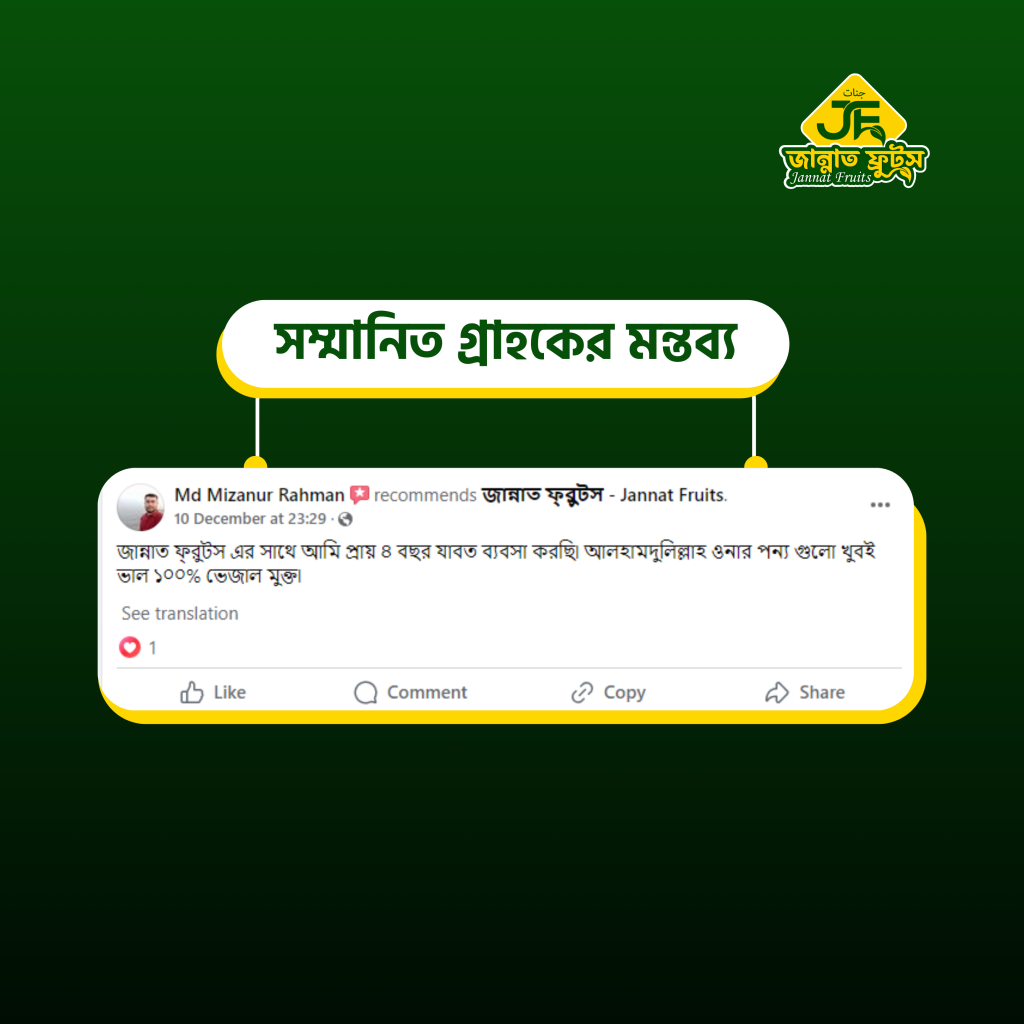 জান্নাত ফ্রুটস এর পিউর ও স্বাস্থ্যকর খাদ্য দুনিয়ায় আপনাকে স্বাগতম ! আমরা শুধু আপনাদের পন্য পাঠায় না সাথে পাঠায় আস্থা, বিশ্বাস আর ভালোবাসা। নিশ্চিন্তে অর্ডার করুন জান্নাত ফ্রুটস সর্বোচ্চ যত্নের সাথে আপনার পন্যটি আপনার ঘরে পৌছে দেবে ।
